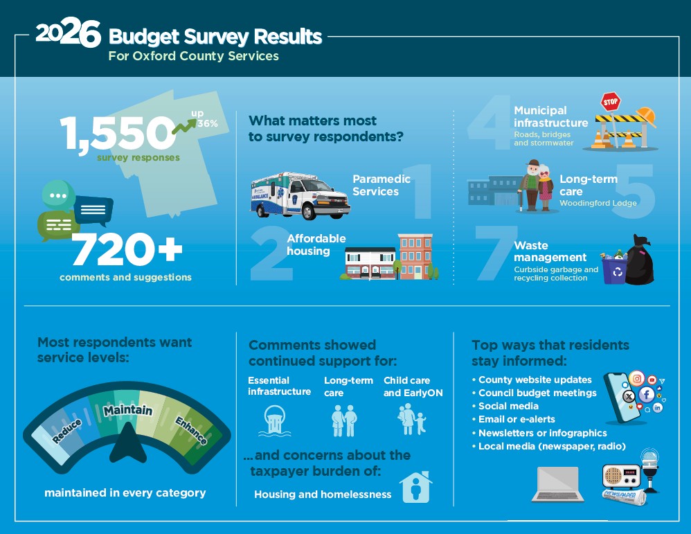 The 2026 Budget Survey was open from June to August this year to allow residents to provide feedback on municipal services and indicate which ones should be a priority in the 2026 budget. Download the survey highlights