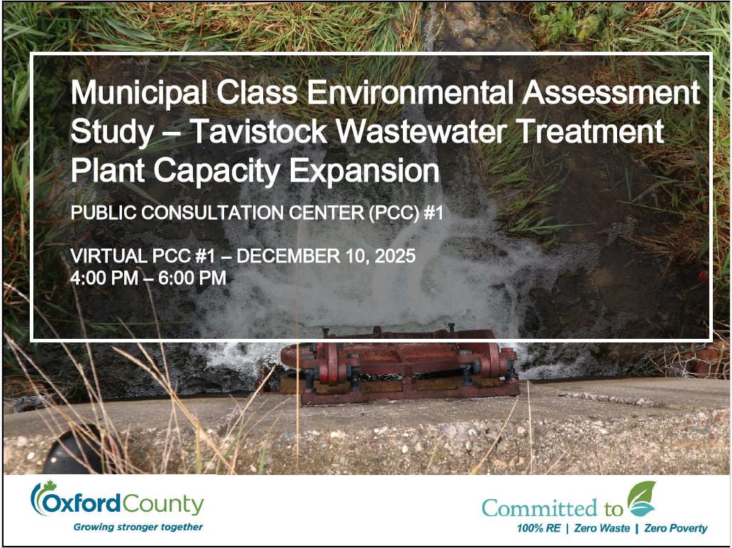 Oxford County is undertaking a Municipal Class Environmental Assessment (Class EA) Study to explore options for expanding the Tavistock Wastewater Treatment Plant (WWTP) in the Village of Tavistock in the Township of East Zorra-Tavistock.
